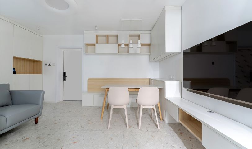客廳由于是間接采光,整體以白色為主,地磚采用了大塊花紋的水磨石,用來活躍空間。