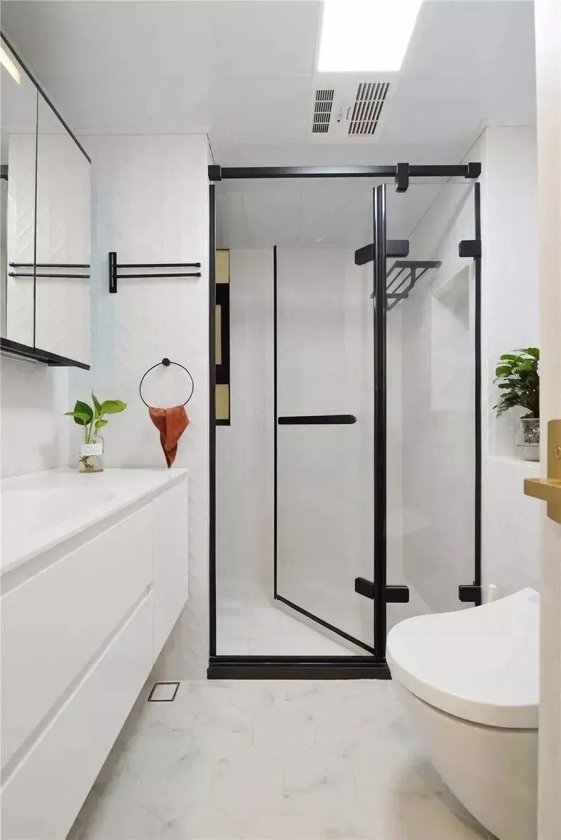 黑框玻璃淋浴房,延續了客廳電視柜和衣帽間的風格,六角瓷磚地面的選擇不同以往,淡雅中增添了一絲趣味,而且更加輕盈整潔。