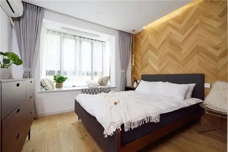 臥室大氣而優雅,隨意自然。步入式衣帽間選擇了無門套嵌入上軌的窄邊框灰色玻璃移門,和電視柜的黑玻璃門對應,平日黑漆漆一片,但是當打開燈光,隱秘的魔法衣帽間閃亮登場。