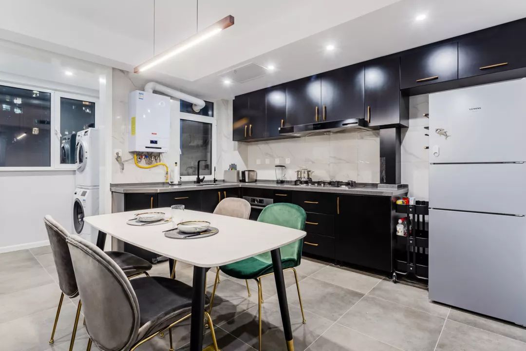 餐廳和廚房被融合在了一起,在櫥柜和餐桌椅上都加入了大理石和金屬元素,整個餐廚空間的配色也比較大氣,看起來就讓人感覺很有檔次