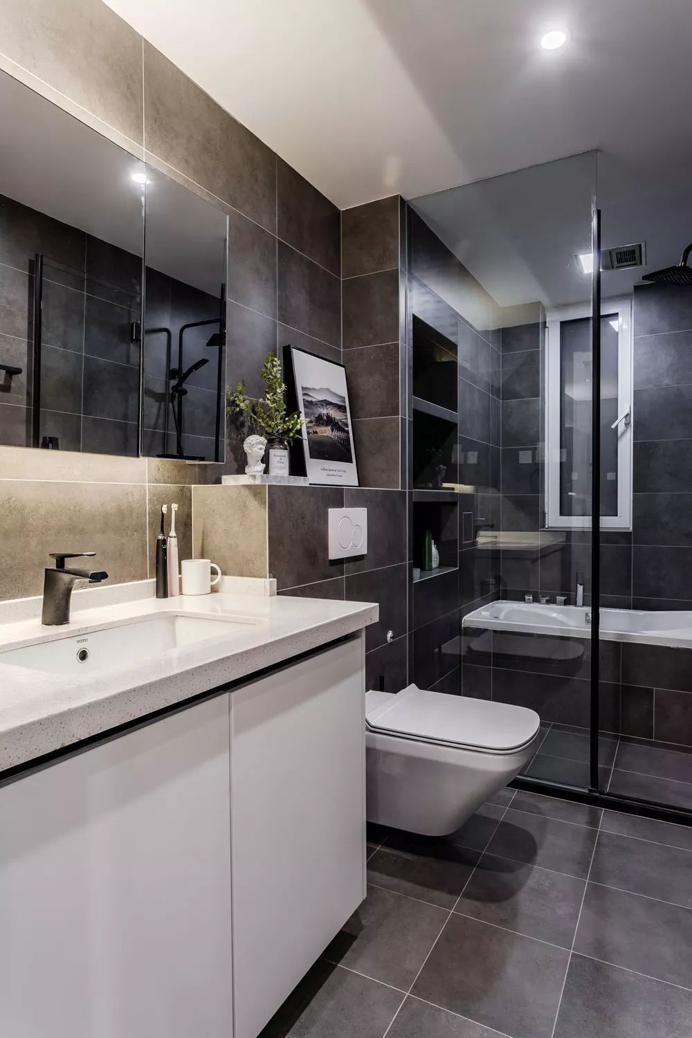 次衛的墻地面都鋪貼了灰色調的啞光磚,在淋浴區內還加入了浴缸,家長淋浴孩子就在一旁泡浴缸,共渡舒適有趣的家庭時光