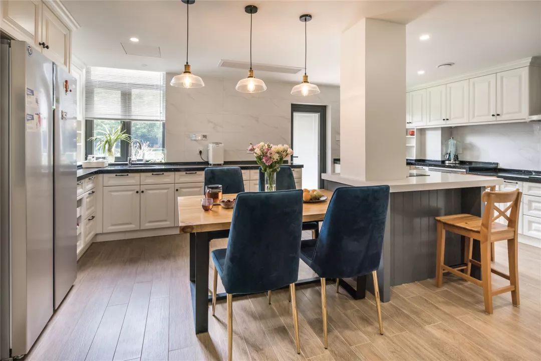 餐廳和廚房被放在了同一個空間,餐桌椅靠著中島臺擺放,廚房的四周做上了櫥柜和吊柜,把各種廚房電器嵌入其中,讓廚房看起來更加簡潔大方,也擁有足夠的儲物空間。