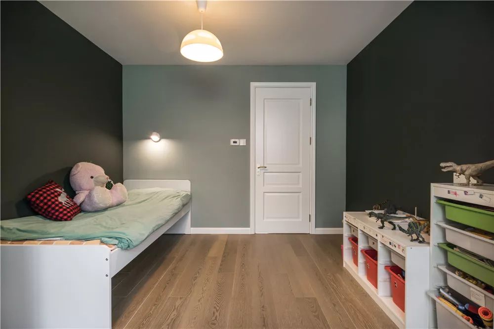 兒童房的墻面刷成了墨綠色,床和收納柜放在房間的兩側(cè),由于二樓還有個獨立的衣帽間,所以兒童房內(nèi)不要再做大衣柜了。