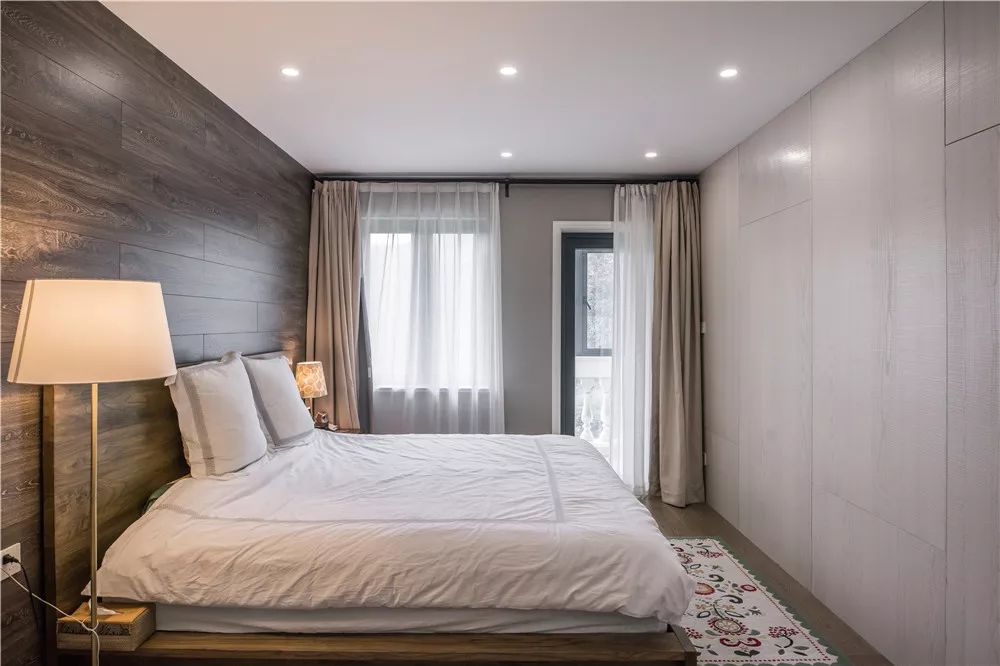 三樓另一側(cè)的空間就是主臥室了,做舊款的木地板被放在了墻上,讓整個空間看起來更有整體感,無主燈的設(shè)計也讓臥室看起來簡潔又大方。