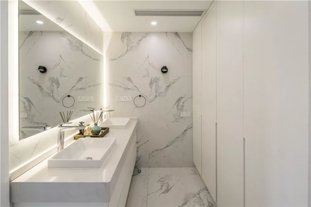 主衛(wèi)的雙人位臺盆和柜子放在了干區(qū),然后把浴缸和淋浴房、馬桶放在另一側(cè),大面積的鏡子搭配背光,再加上白色為主的設(shè)計,讓衛(wèi)生間看起來非常明亮。