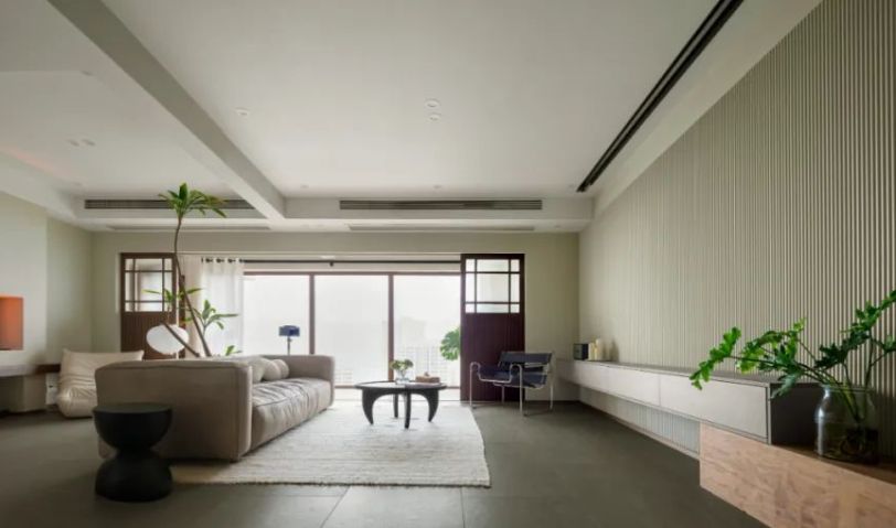 屋主想運動的同時可以觀看電影,同時要有相對的遮擋隱私,我們在陽臺和客廳之間做了可移動的隔斷門扇,空間更加完整又不失靈動。