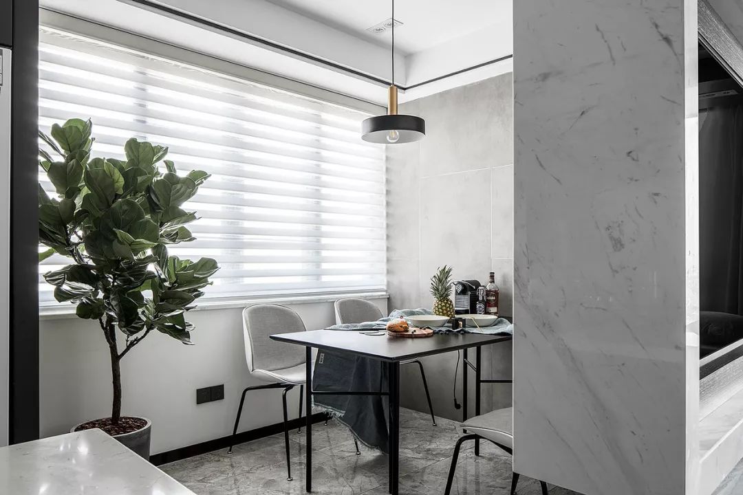 從客廳可以看完餐廳和廚房,廚房?jī)?nèi)部是L型櫥柜搭配島臺(tái)的設(shè)計(jì),深色系的櫥柜和大理石地面結(jié)合起來,顯得精致而又優(yōu)雅。