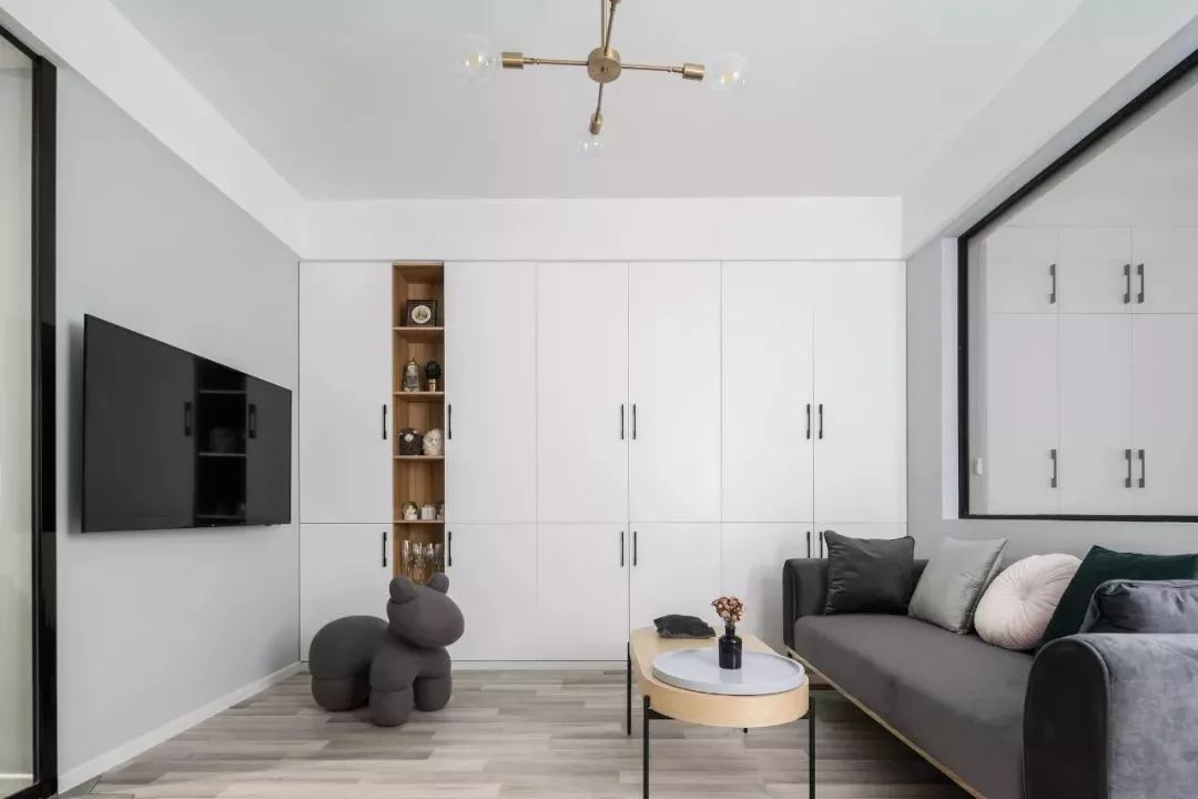 客廳位于餐廳的另一側(cè),迷你的茶幾讓空間更顯寬敞。在客廳的一側(cè)做上了嵌入式的到頂柜子,給這個(gè)小窩增添了不少的儲物空間。