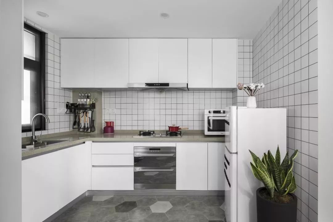 廚房的櫥柜做了L形的布局方案,把水槽放在靠窗的位置,方便水汽散發(fā)。櫥柜轉(zhuǎn)角的空間被利用起來做了收納,冰箱靠著墻面擺放。