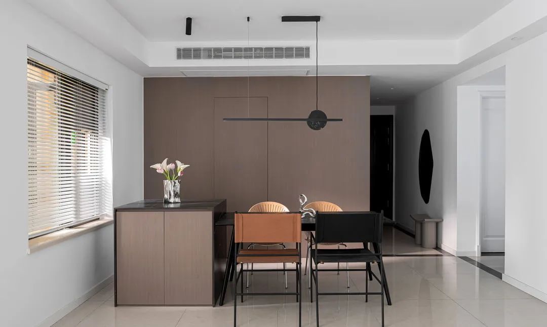餐廳與客廳一體設(shè)計(jì),保持空間開(kāi)闊,空間利用率也得以提升。沒(méi)有明顯隔斷,通過(guò)燈具和家具進(jìn)行分區(qū)??紤]到常住人口不多,放棄了大長(zhǎng)桌的選擇,以餐桌結(jié)合島臺(tái)的設(shè)計(jì),一方面增加了餐廳收納,另一方面也讓?shí)u臺(tái)與餐桌有一個(gè)遞減層次感。