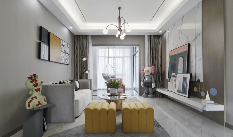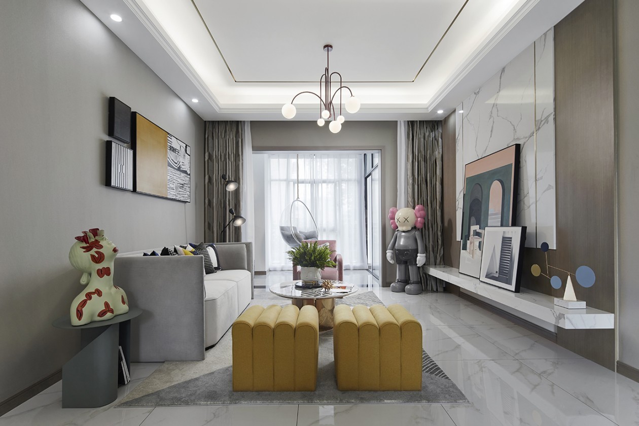 米白質感石材和灰調家具營造現代感,一抹明媚的黃率先闖入眼簾,融入簡約幾何圖形的軟裝飾品