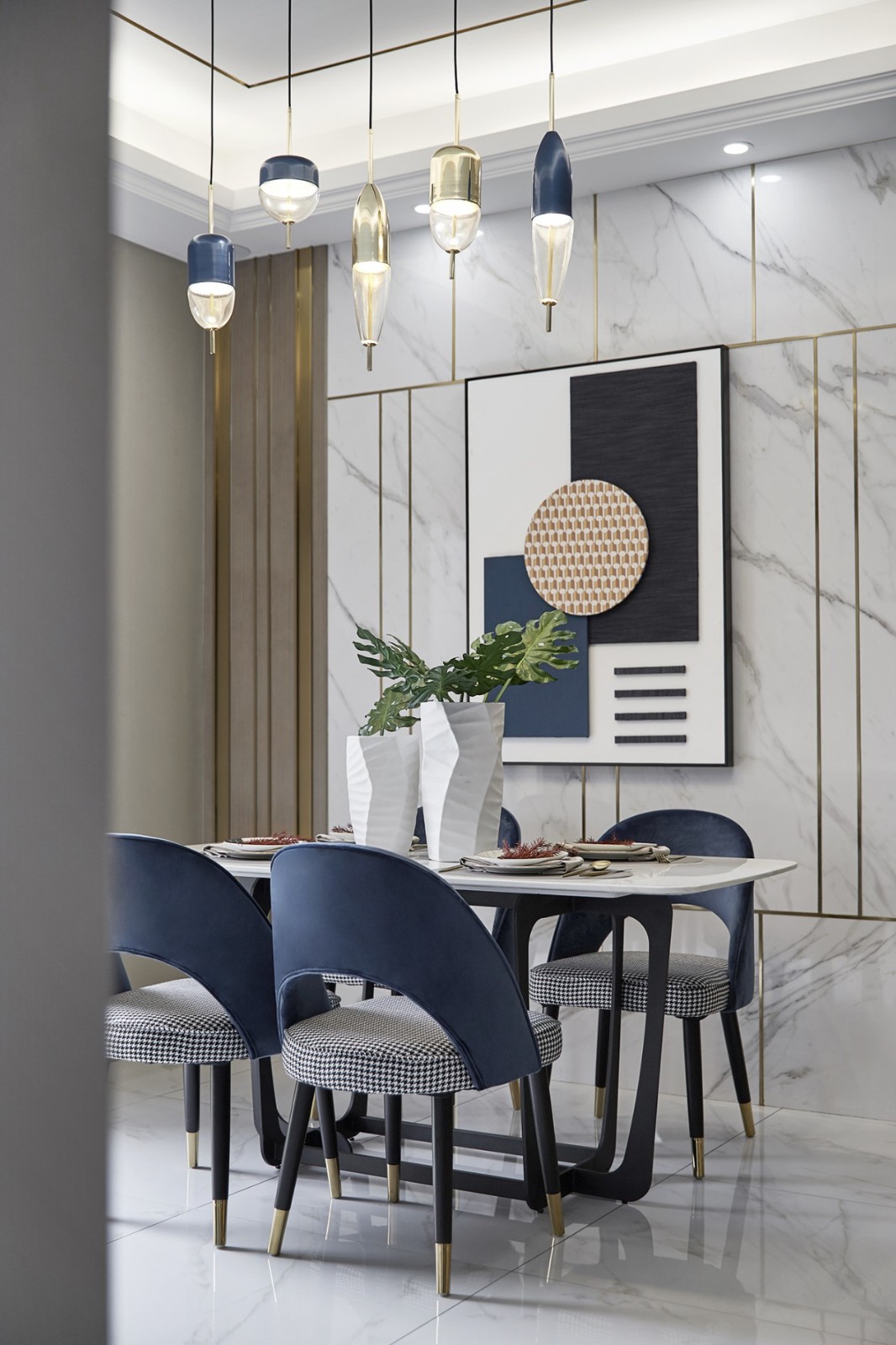敞開式廚房增加了更多互動的場景感,瓶子形制的吊燈將暖黃光線溫柔灑落,映襯著油藍色的布藝座椅。冷暖色互補的幾何裝飾個性時尚賦予空間更深層次的人文氣息。