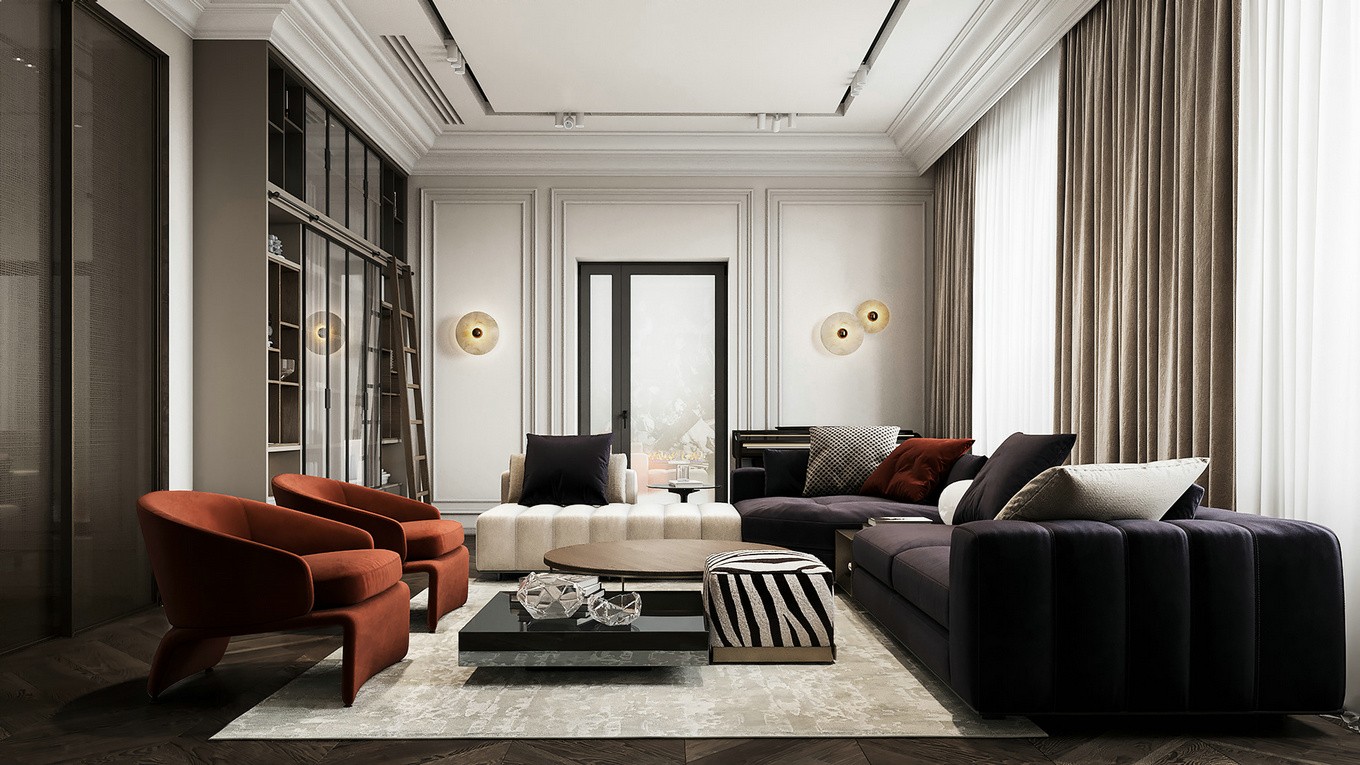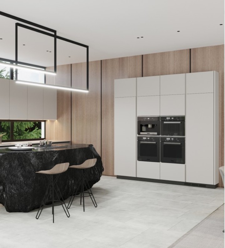 廚房采用不規則臺面,打破整體的線條感,讓房間充滿動感