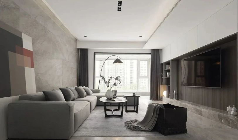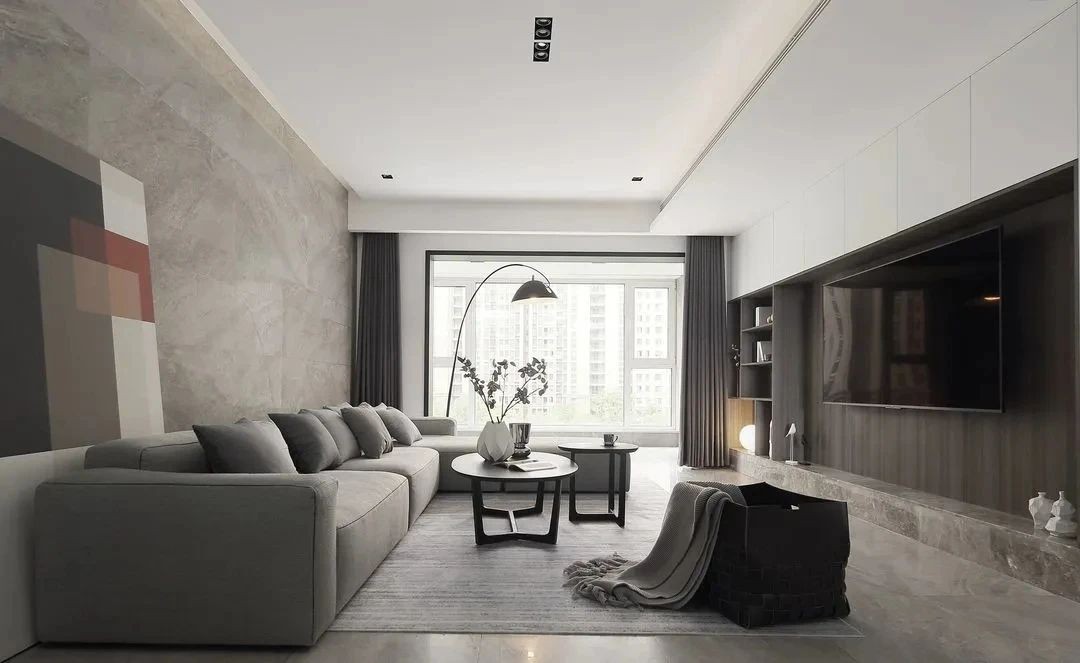 灰白木的簡潔色調讓客廳空間看起來賞心悅目,客廳與陽臺空間打通,落地透明玻璃將視野完全打開,屋外的美景盡收眼底,采光也更加的充足。
