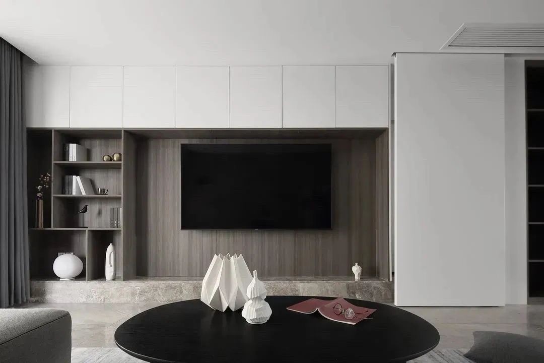 電視背景墻集美觀與實用于一體的收納柜和展示柜組合設計,既滿足了空間的視覺效果又兼具收納功能。