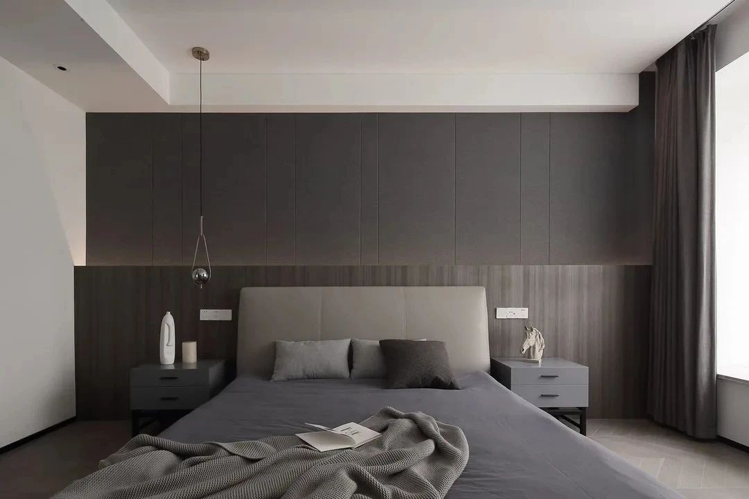深沉而內斂是主臥室的基調,明暗之間是光影的游戲也是設計的巧思。
