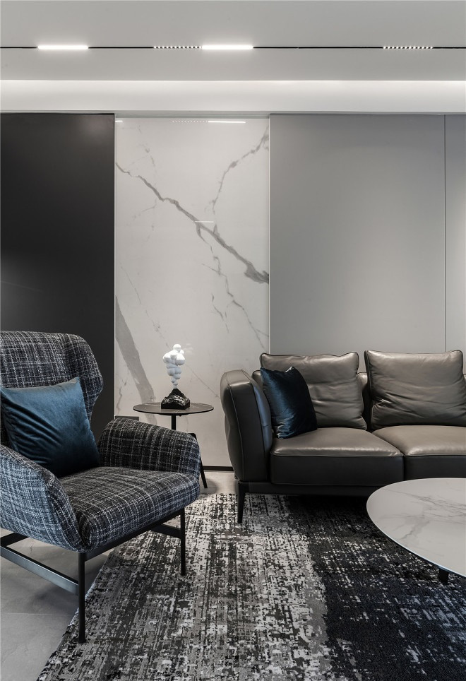 材質(zhì)顏色上面使用了深灰色的護(hù)墻板,中灰的皮沙發(fā)還有地毯,黑色巖板的電視柜,角幾和單人椅子加上華爾思音響。通過(guò)多處巖板過(guò)渡,使得整個(gè)空間顯得非常有層次感和***感。
