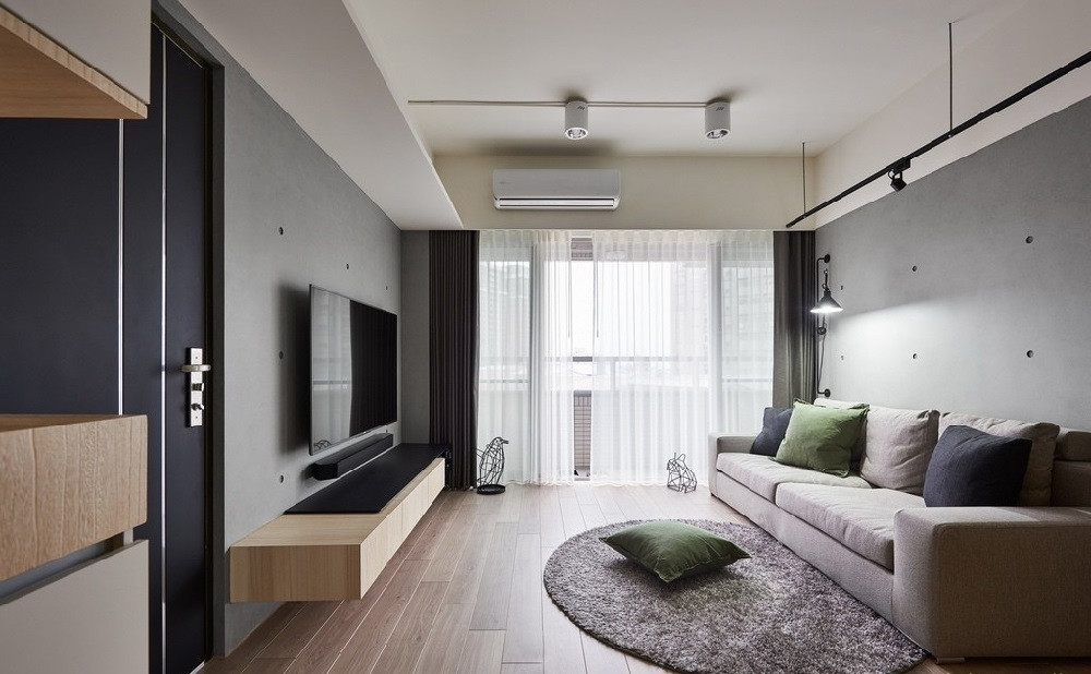 客廳空間,背墻是新作的墻面表面使用清水模涂料。