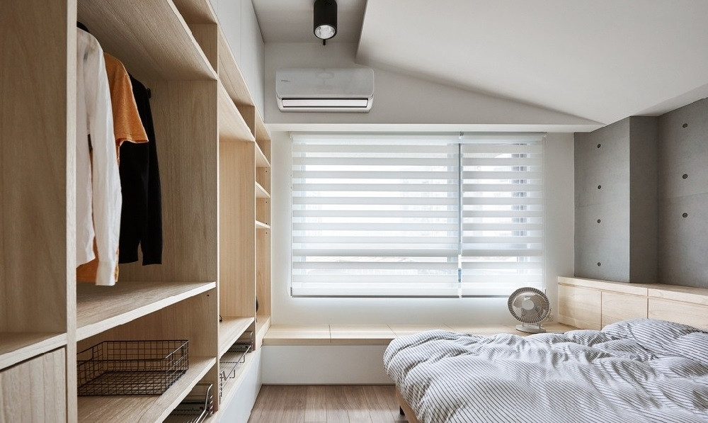主臥原木色衣柜和地板,灰色的床品,濃濃的無印風,簡約自然。