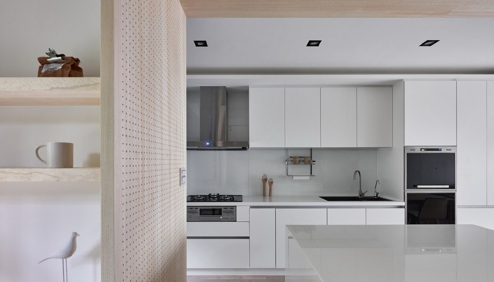 冰箱柜隱藏在洞洞墻的后方,因為深度關系,冰箱后柜也可以利用變成淺收納柜。