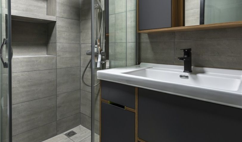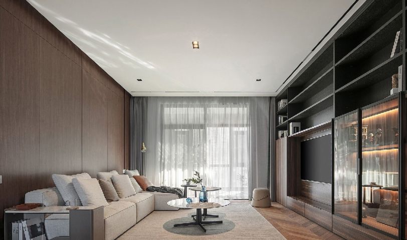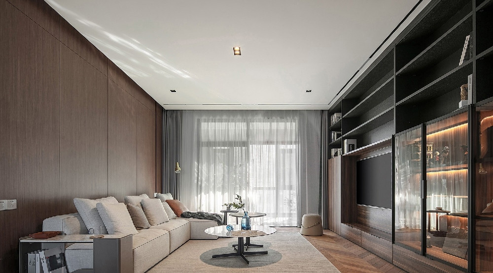 屋主希望客廳要簡潔大氣,電視背景可以留白或做整面的柜子,恰好客廳的尺寸夠大,所以,我們在沙發背景做了減法,電視墻做了整面展示柜。