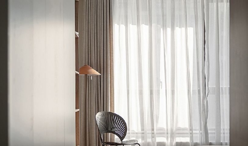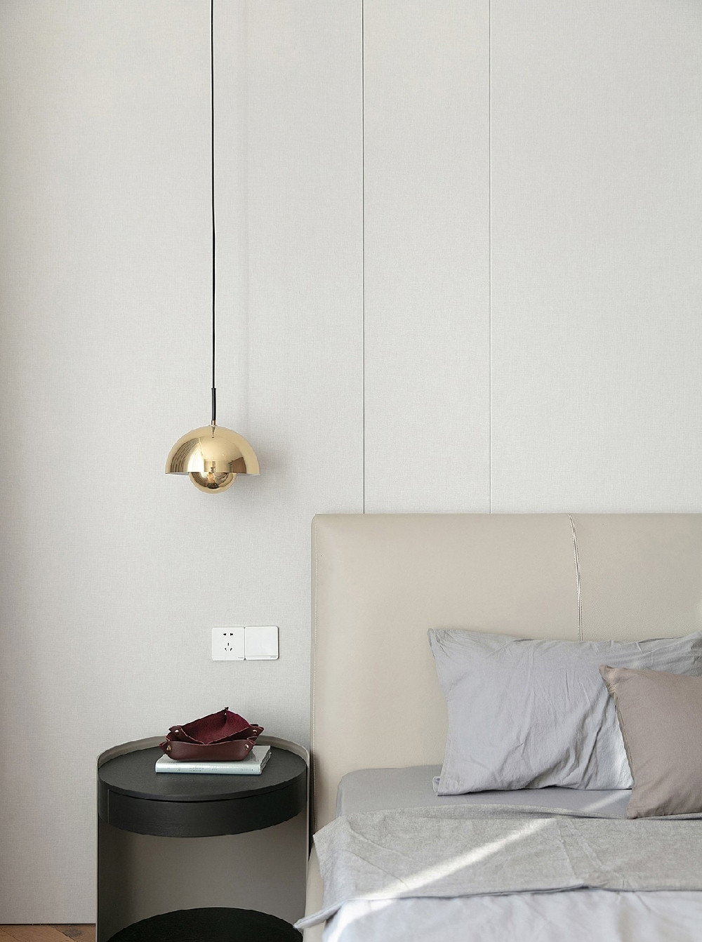 主臥的光線夠好,屋主也希望可以簡潔明亮,床頭淺色的布墻板系統,恰好滿足了空間需求。