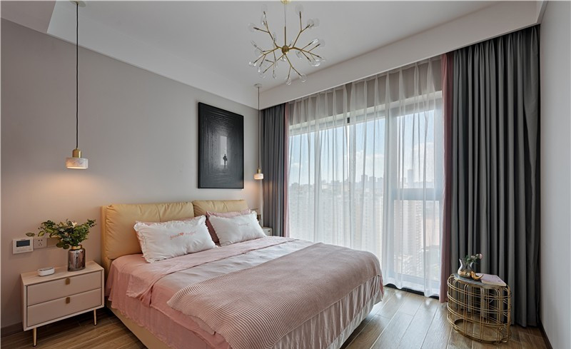 在設計上,我們在主臥處理上并沒有延續客廳的冰冷感,而是營造了溫暖宜居的精致空間。