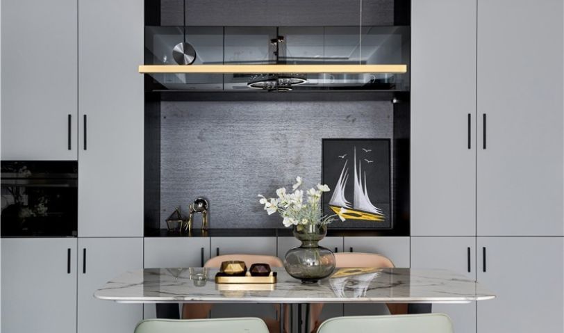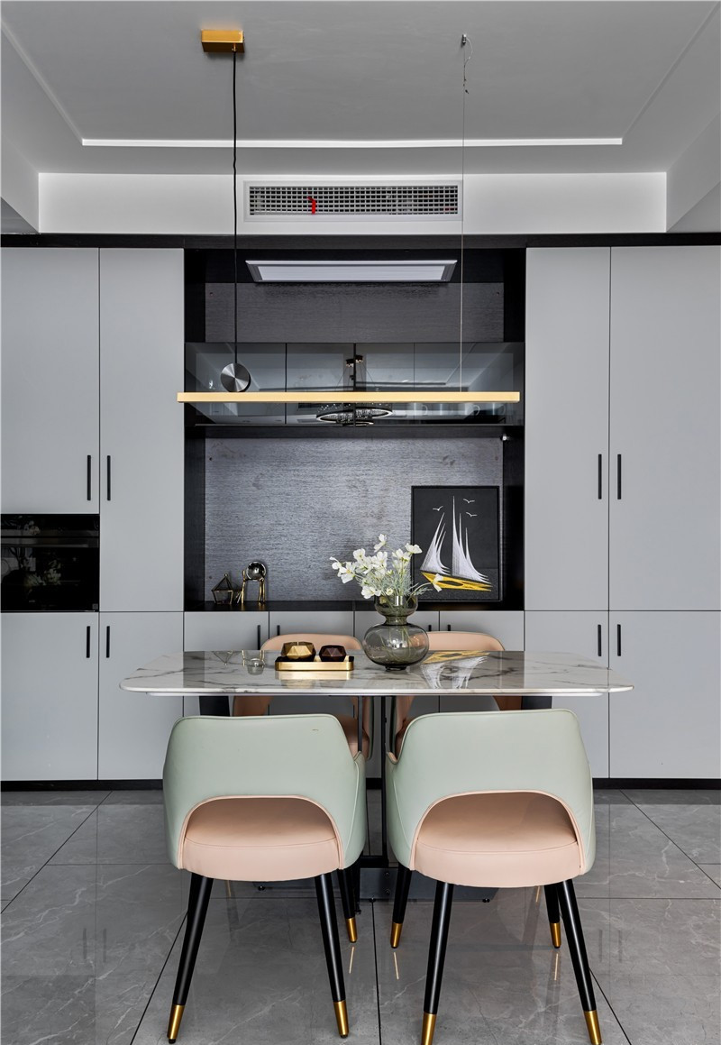餐廳區域承接了整個公共空間的動線,通過空間劃分依靠墻面做滿墻的餐邊柜,雙色拼接以及虛實處理很好提升質感,同時內嵌電器設備也緩解廚房收納壓力。