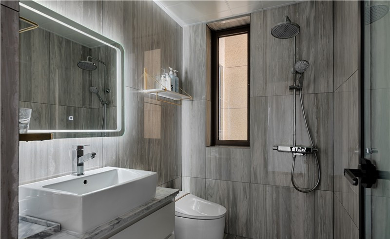 主衛生間采用淡灰色紋理瓷磚作為基調,配合黑色以及白色柜體,營造簡約精致的空間。