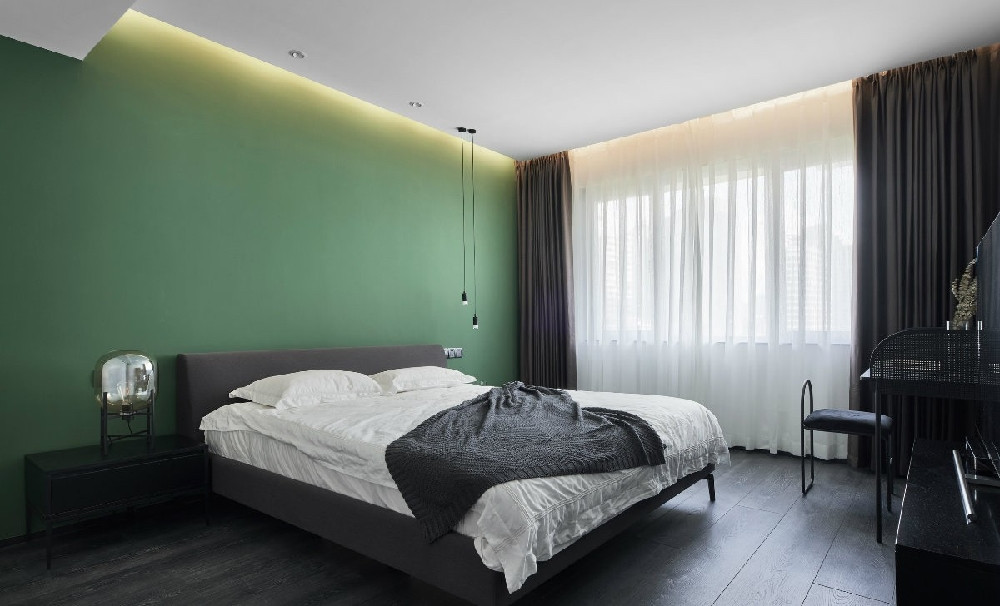 因?yàn)槲葜飨矚g綠色,綠色是讓人具備安全感的顏色,還有寧神的作用,所以主臥墻體大膽采用森林綠,黑胡桃木家具,和白色床品形成對(duì)比,在沉靜的空間中,儲(chǔ)備的新能量。
