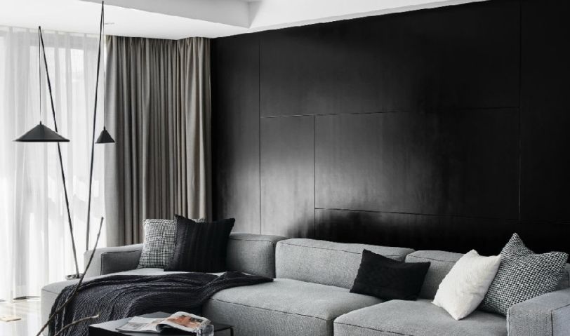 整個(gè)客廳空間采用黑白灰的基調(diào),灰色L型沙發(fā)搭配黑色背景, 點(diǎn)綴千鳥(niǎo)格抱枕,線條簡(jiǎn)約流暢,色彩對(duì)比強(qiáng)烈。