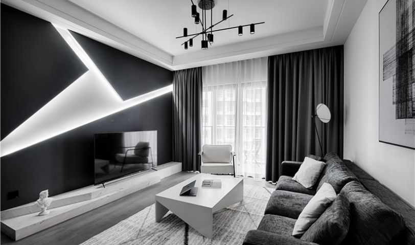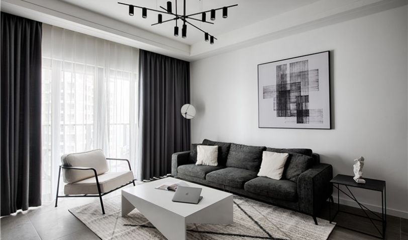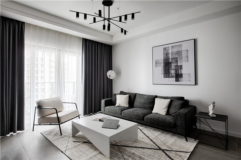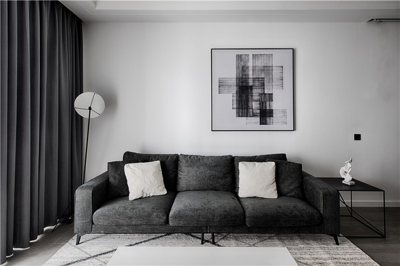 沙發和窗簾是不同灰度使用,大白墻只用一幅抽象的黑白掛畫裝飾。