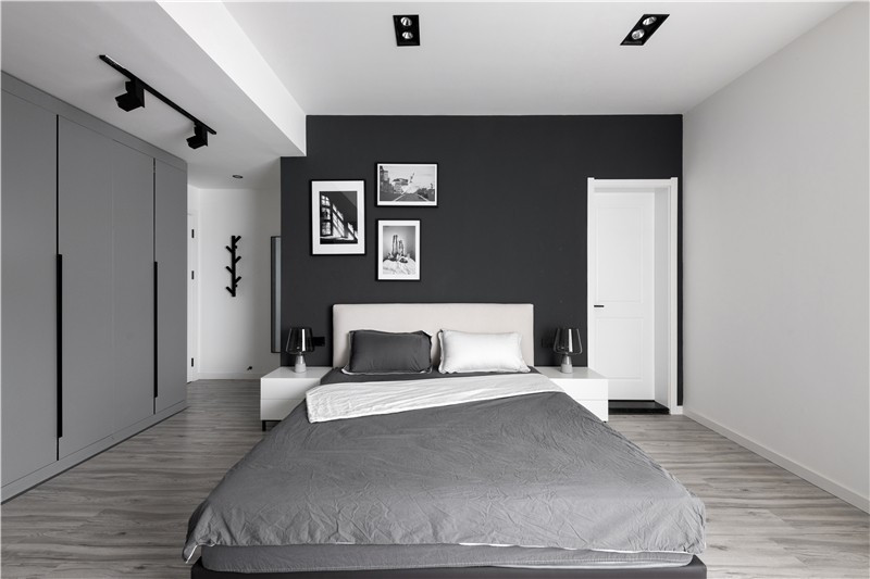 在用色上面同樣是考慮黑白灰三色的交替使用,床頭墻面使用黑色,掛畫使用黑邊白底內容同為黑色。