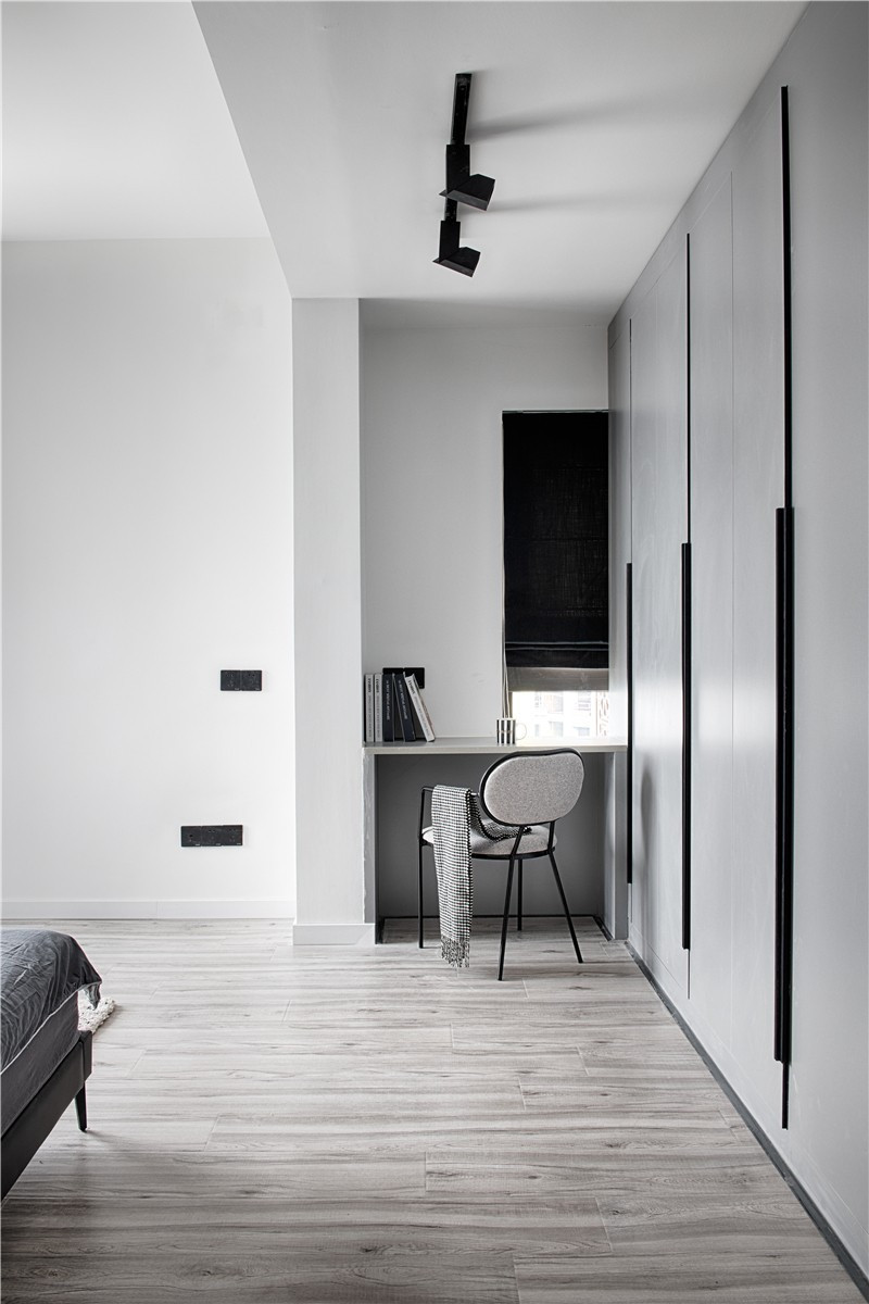 主臥室沒有在單獨分隔衣帽間,而是直接做的整墻衣柜,目的是盡可能讓主臥室的空間暴露出來,以滿足業主對于大空間主臥室的需求。