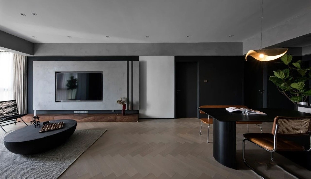設(shè)計(jì)師在全屋設(shè)計(jì)上以水泥漆,黑白烤漆、人字拼木地板為主,主色灰與黑。搭配實(shí)木電視柜、實(shí)木五斗柜、藤編座椅、以及綠色植物,平衡空間的冷暖。在現(xiàn)代簡(jiǎn)約的家中觸摸復(fù)古元素。