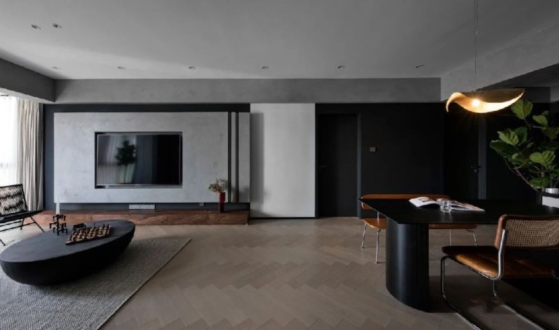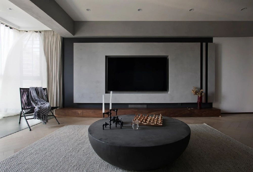 先以木作打底,形成基本造型后刷上素色水泥漆;再于右側(cè)切割出兩條立體錐形豎條,打破墻面的呆板感;最終落成簡(jiǎn)約而時(shí)尚的電視背景墻,黑色的電視機(jī)協(xié)調(diào)地嵌于其中。在“黑墻”上,灰色的電視背景墻凸顯而出,更具體塊感。