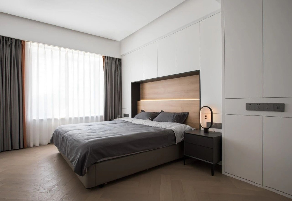 臥室是一個(gè)完全私密和放松的場(chǎng)所,摒除不必要的裝飾,減少生活的累贅。墻面上毫無(wú)多余修飾,床后白色的收納柜在營(yíng)造簡(jiǎn)潔氛圍的同時(shí)可以存放大量書(shū)籍,滿(mǎn)足H喜愛(ài)在房中看書(shū)的需求。
