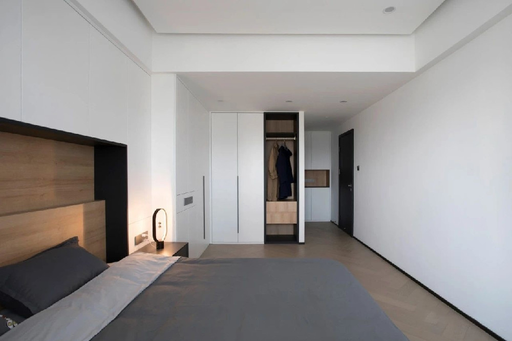 衣柜柜門(mén)采用白色,讓臥室面積在視覺(jué)效果上得以放大。增加無(wú)門(mén)衣柜,既是方便放置次凈衣,也讓常用衣物的拿取更為便利。