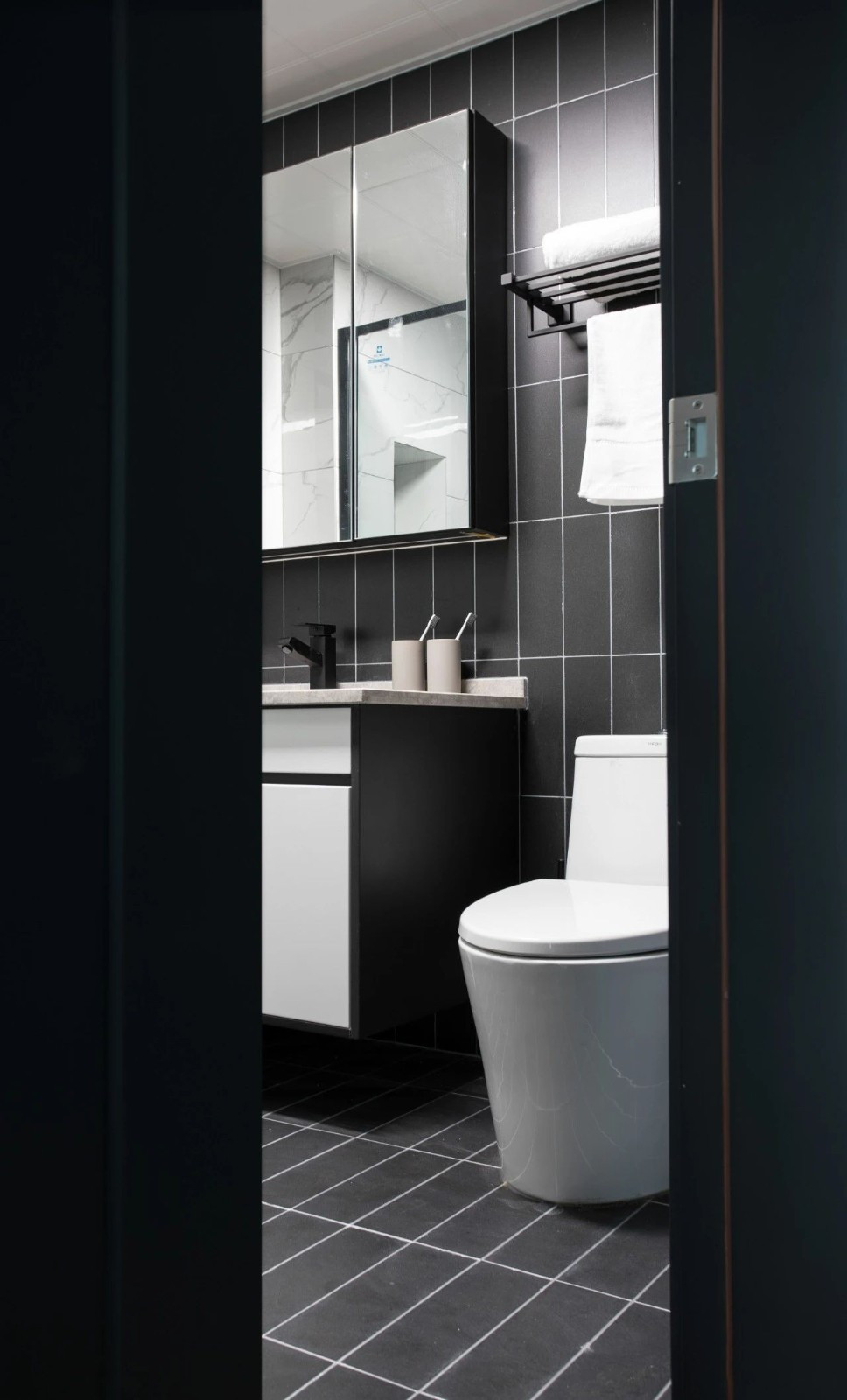 黑色的衛(wèi)生間符合全屋的格調(diào)。設(shè)計(jì)師利用鋪設(shè)墻地一體的瓷磚,讓小小的空間有了延伸感。
