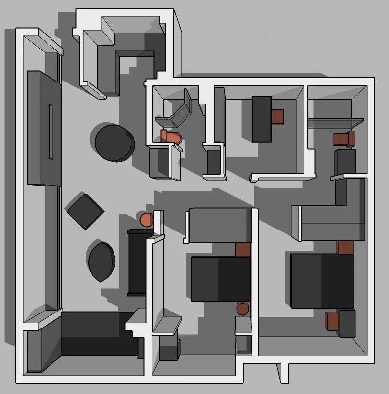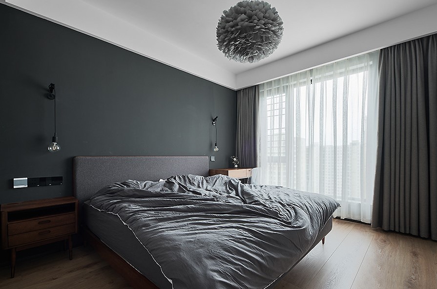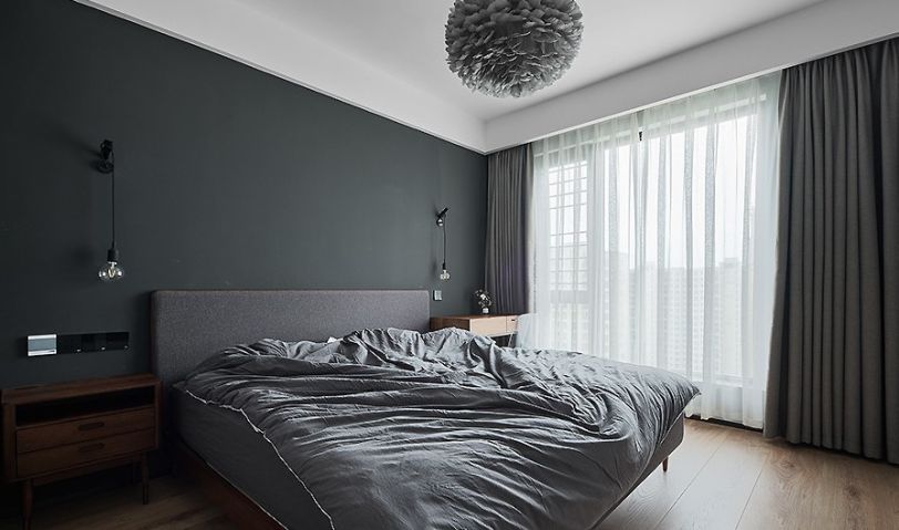 主臥整體以暗灰為主色調(diào),柔軟的織品,溫暖的木地板,完美營造舒適放松的睡眠環(huán)境。