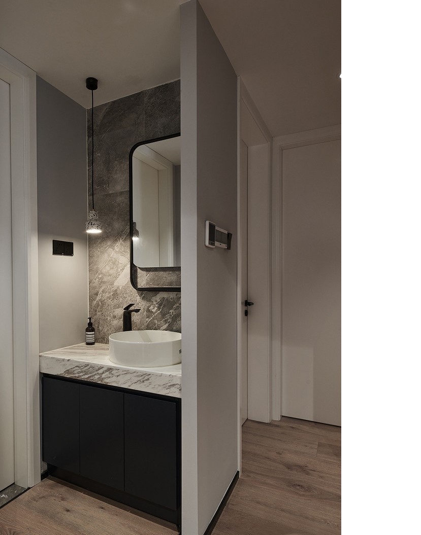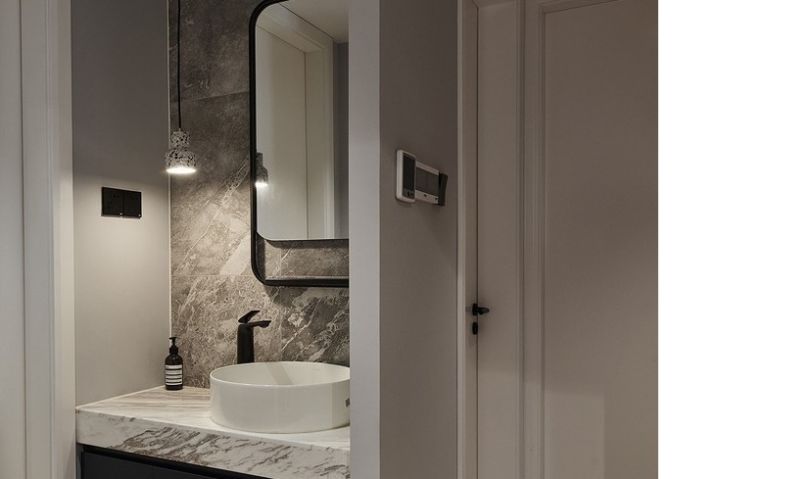 衛(wèi)生間干濕分離提高居住品質(zhì),干區(qū)墻面以仿大理石磚+防水乳膠漆打造,充滿了高級質(zhì)感。臺(tái)盆與鏡子采用偏離中心式擺放方法,在美觀的同時(shí)兼顧實(shí)用。