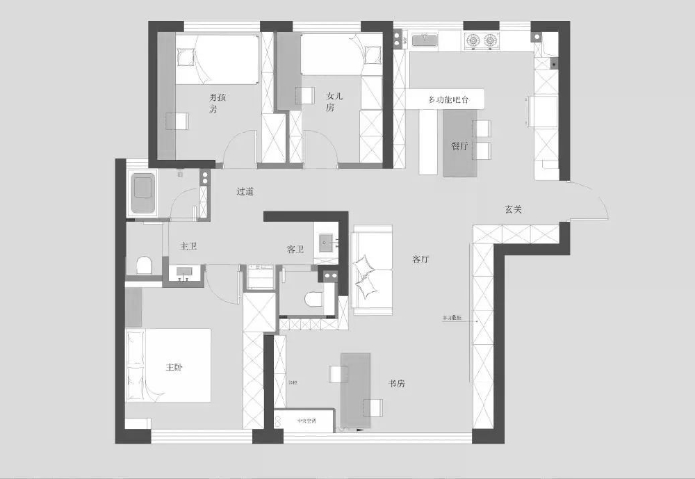 作為121㎡的三居,房型方正,采光條件也很棒。屋主則希望好上加好,讓房子的優勢可以再放大一些。布局較為合理,所以只進行局部改善。結構改動主要集中在客餐廳,將采光優勢發揮到最大,增強各個空間之間的溝通。