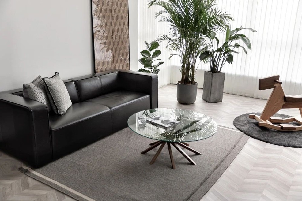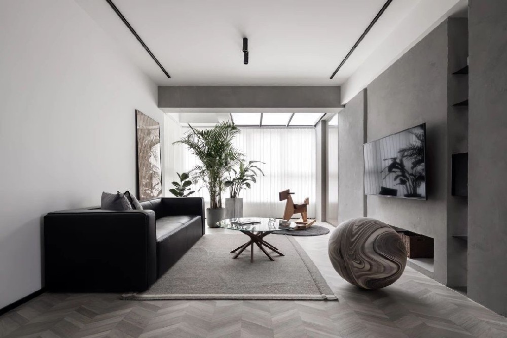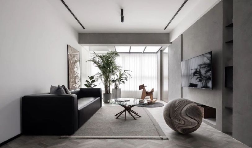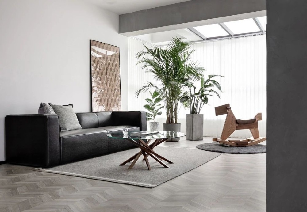 魚骨拼地板和藝術水泥漆碰撞中和, 樹皮裝飾畫同陽臺的綠植遙相呼應, 黑色皮質沙發正合業主想要的男人氣概, 同時簡約的氣質和整個家的格調也甚是相配。