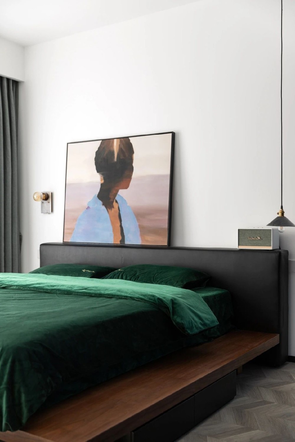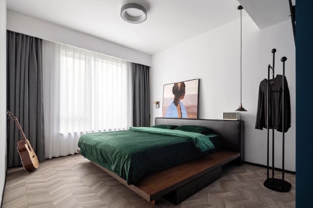 床的造型別具一格, 脫鞋睡覺都有一種登堂入室的儀式感。 搭配墨綠色絲絨床品,復古大氣。 柔軟親膚的質感, 讓人一秒就淪陷在溫暖的幸福中。