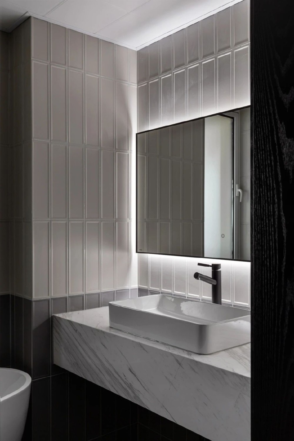 衛生間由頂面到地面形成白色到黑色的遞變, 形成干凈、簡潔、利落的風格。 鏡面四周做了燈帶, 既是補充照明, 也讓鏡面顯得更加輕盈。