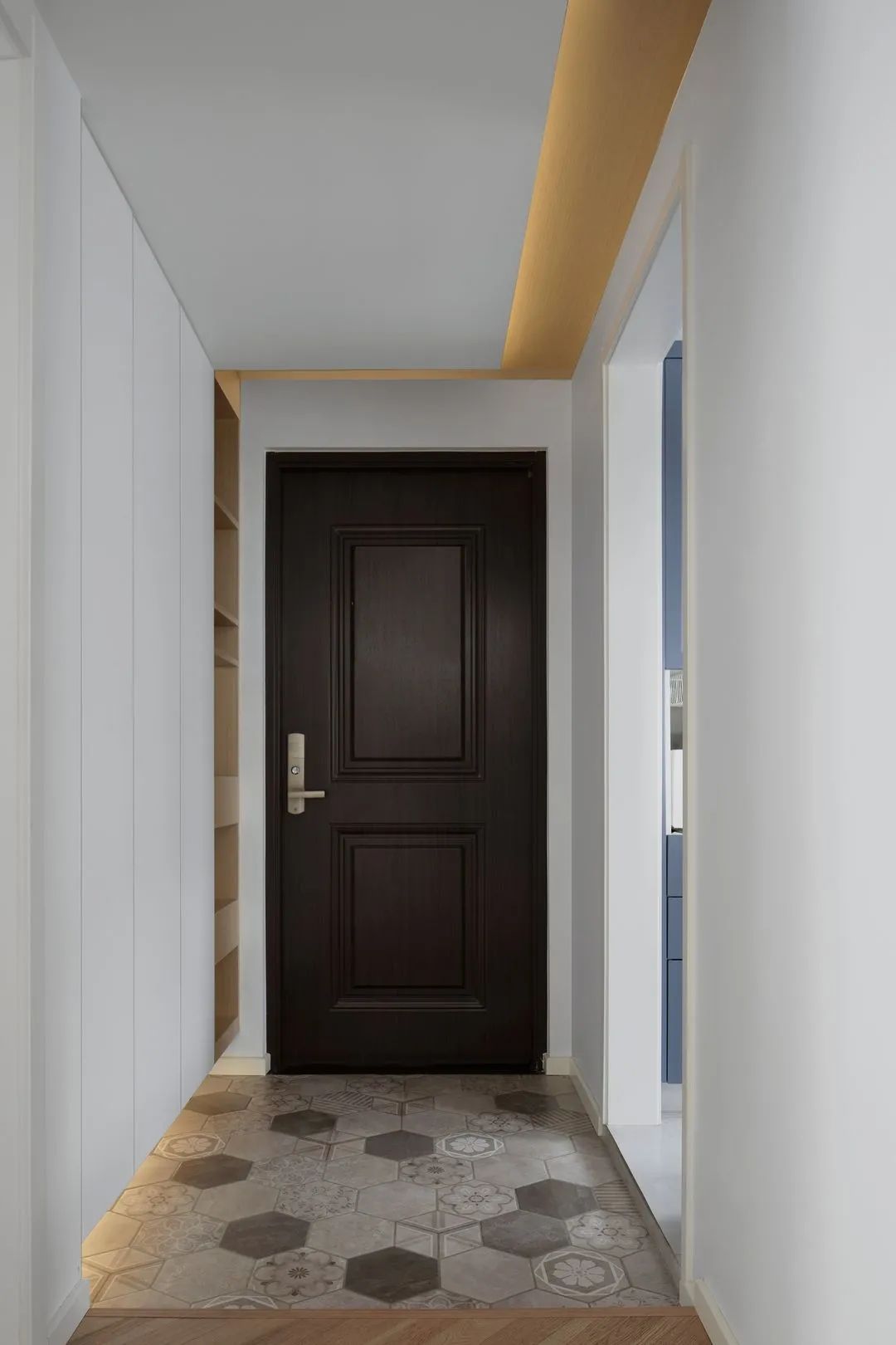 特色的下沉式玄關(guān),規(guī)劃出入戶落塵區(qū),將室外的灰塵隔絕在門廳,鋪設(shè)方便清潔打理的磚面以減少家務(wù)量,室內(nèi)也因此更加干凈整潔。
