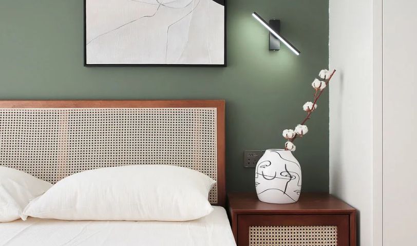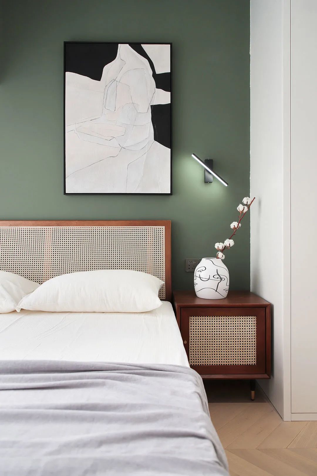 復古的墨綠色床頭背景墻與藤質的床頭靠背、白色的衣柜,彰顯出的文藝與沉靜。通過掛畫、軟裝、整體搭配出舒適溫馨的睡眠環境。