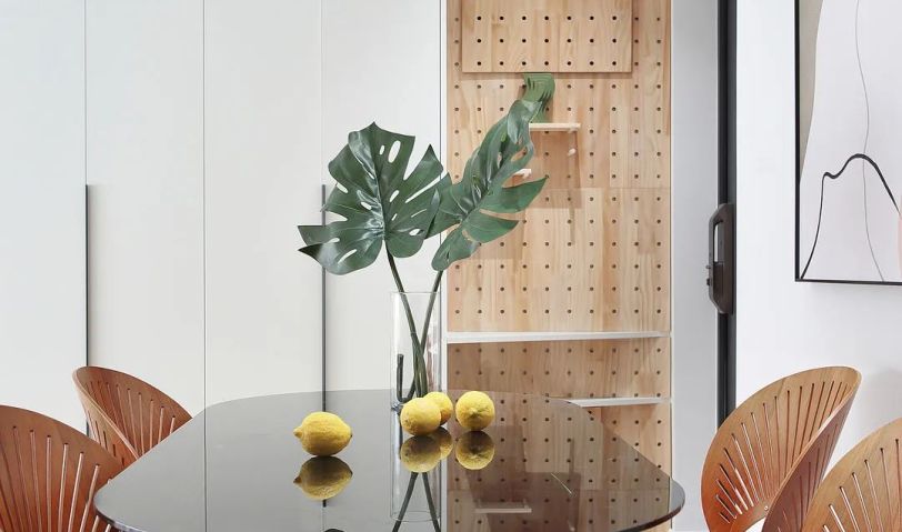 整個空間都是呈現出簡約的狀態,木色作為地面基色搭配素白的色調,綠色作為跳躍色,剛好拼湊在這個空間里。在設計上,沙發背景墻設計了一個有弧度的造型,提升線條美感,放眼望去,會比直角更加柔和。