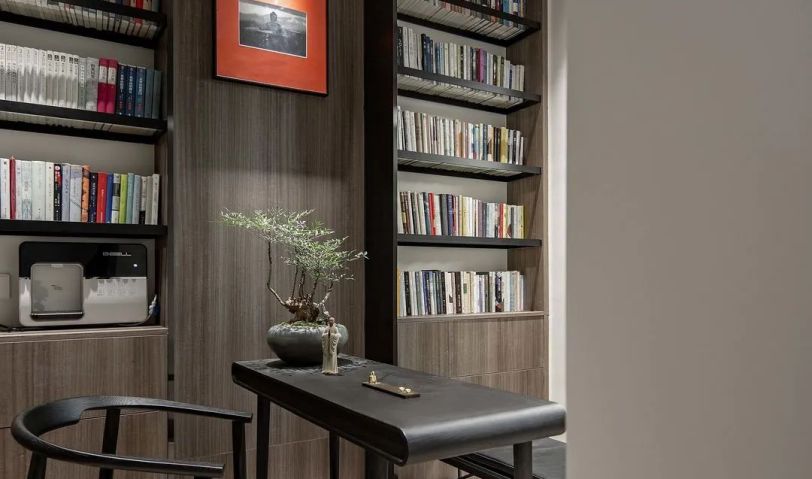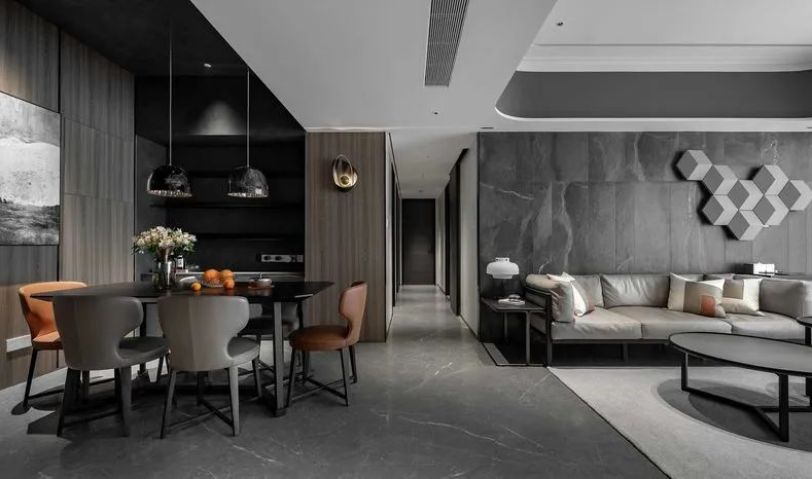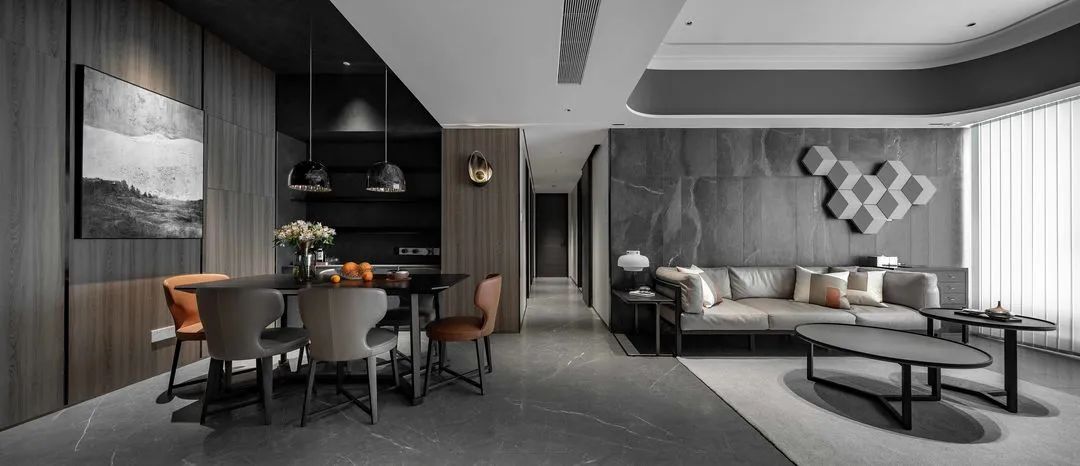 屋主陳先生是一位儒雅的70后,飽讀詩書且看過大千世界,整體裝飾元素都是沉穩克制的,灰調的材質雖暗卻明,點綴零星橘色軟裝提亮空間