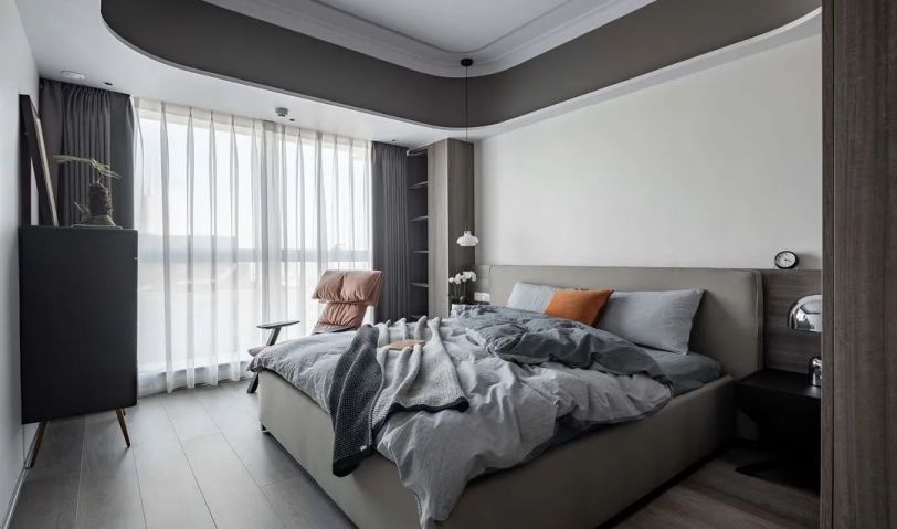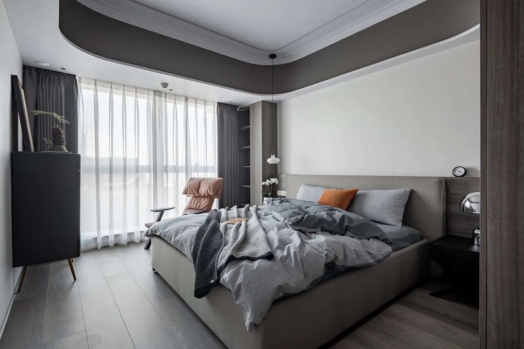 床尾的斗柜可作為疊放的衣物補充。床邊書柜滿足屋主睡前閱讀的習慣
